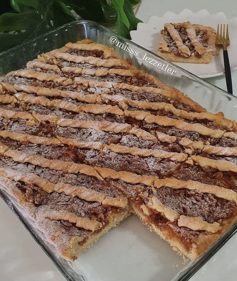 Kalan hamuru önceden yağladığınız borcama yayalım Üzerine Önceden pişirdiğimiz elma püresini Yayıyoruz ve bir parça hamur ayırmıştık onunla isteye göre süsleyebiliriz