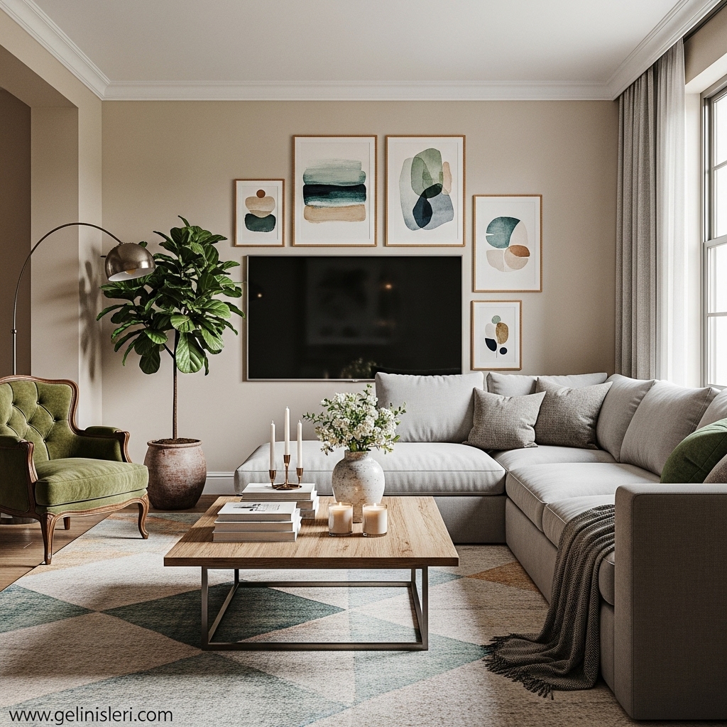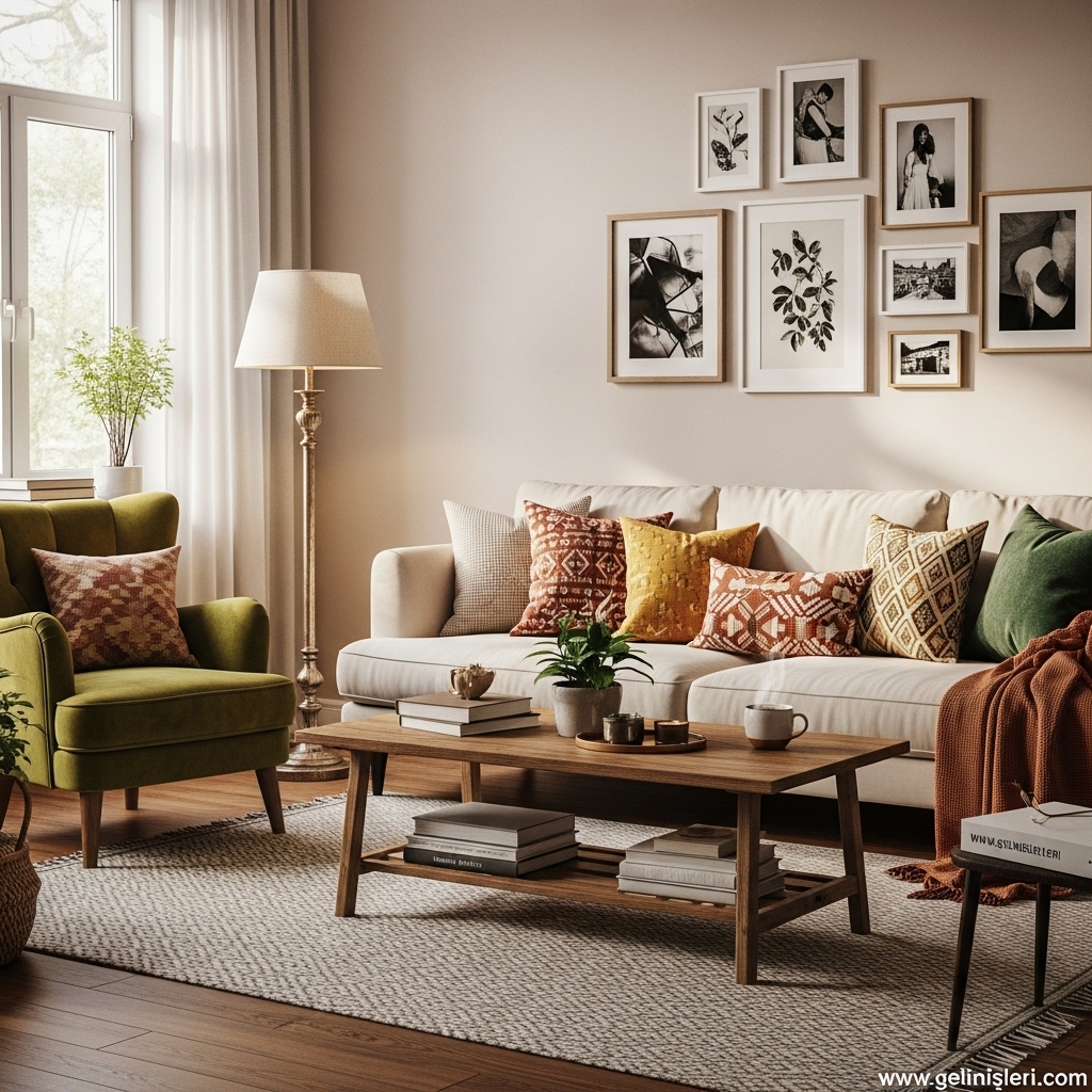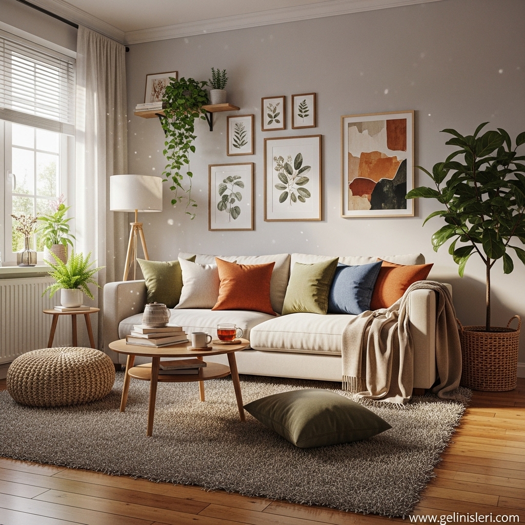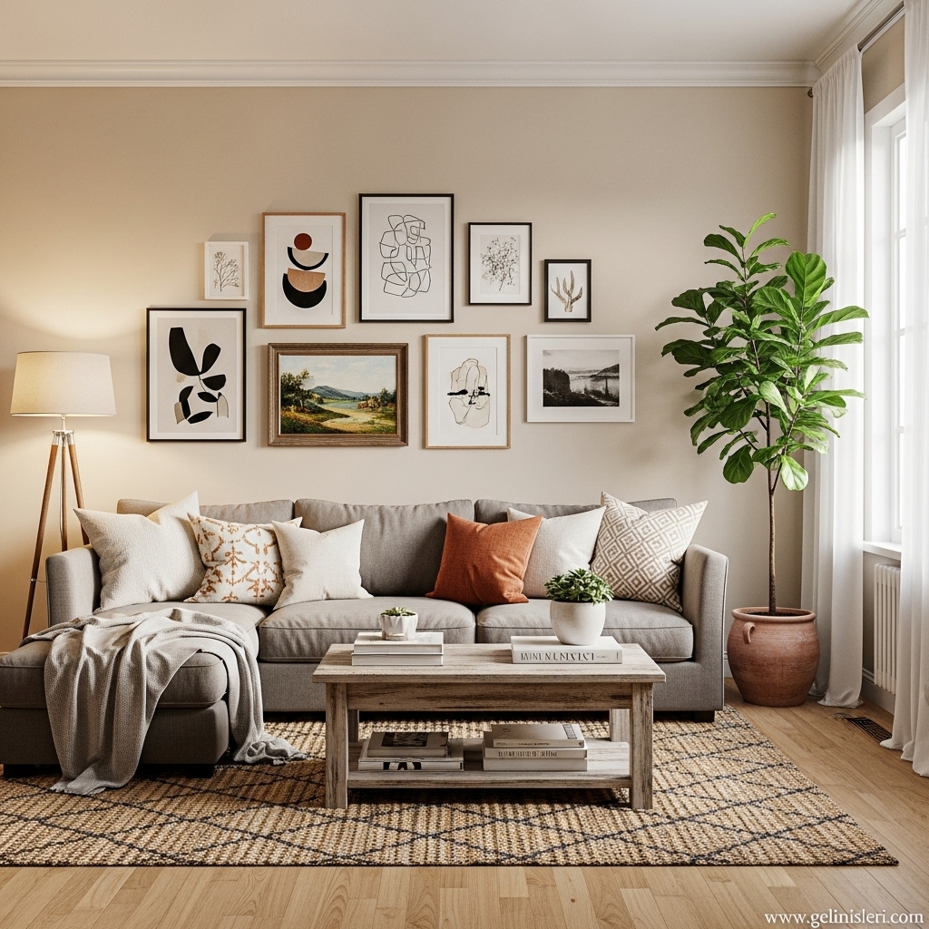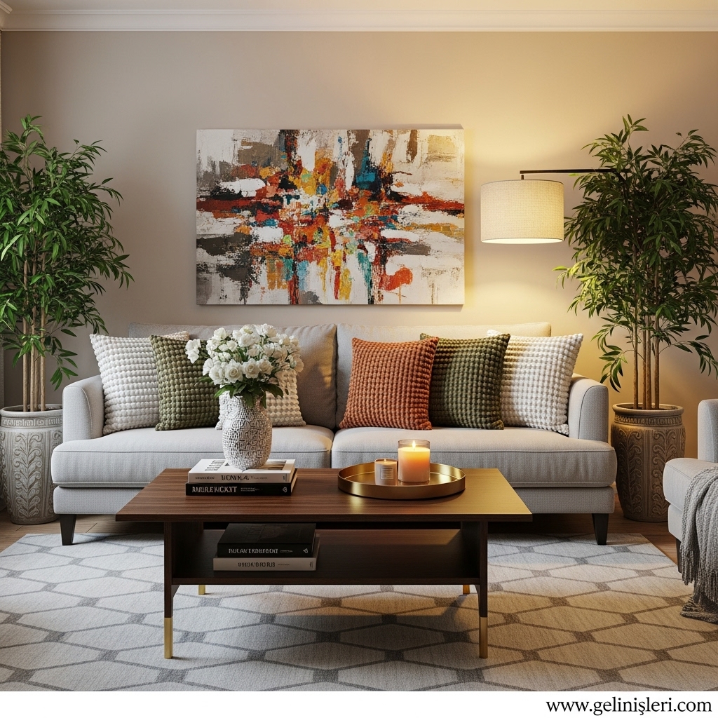 Duvar tabloları, dekoratif yastıklar ve doğal dokulu objeler oturma odasına kişisel bir dokunuş katar.