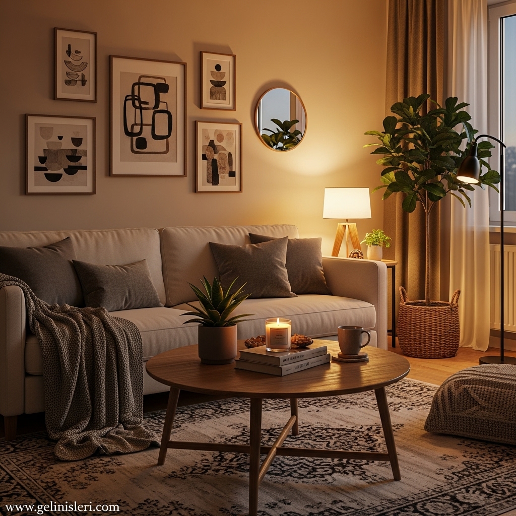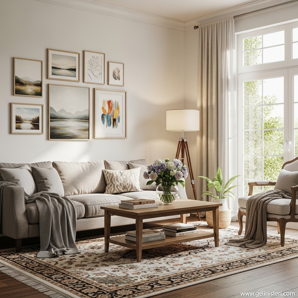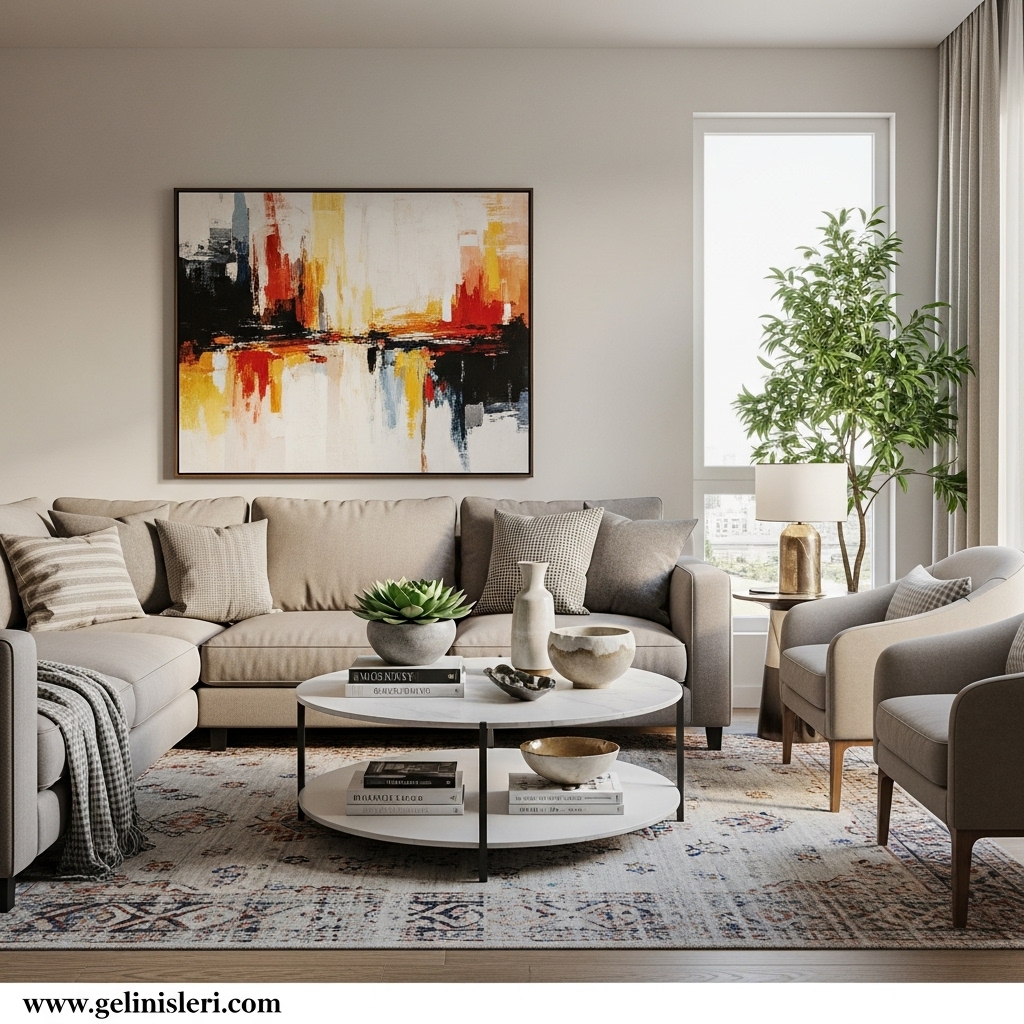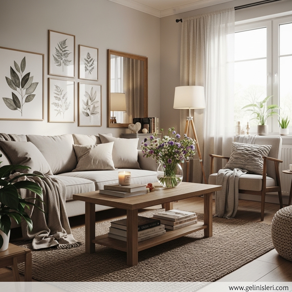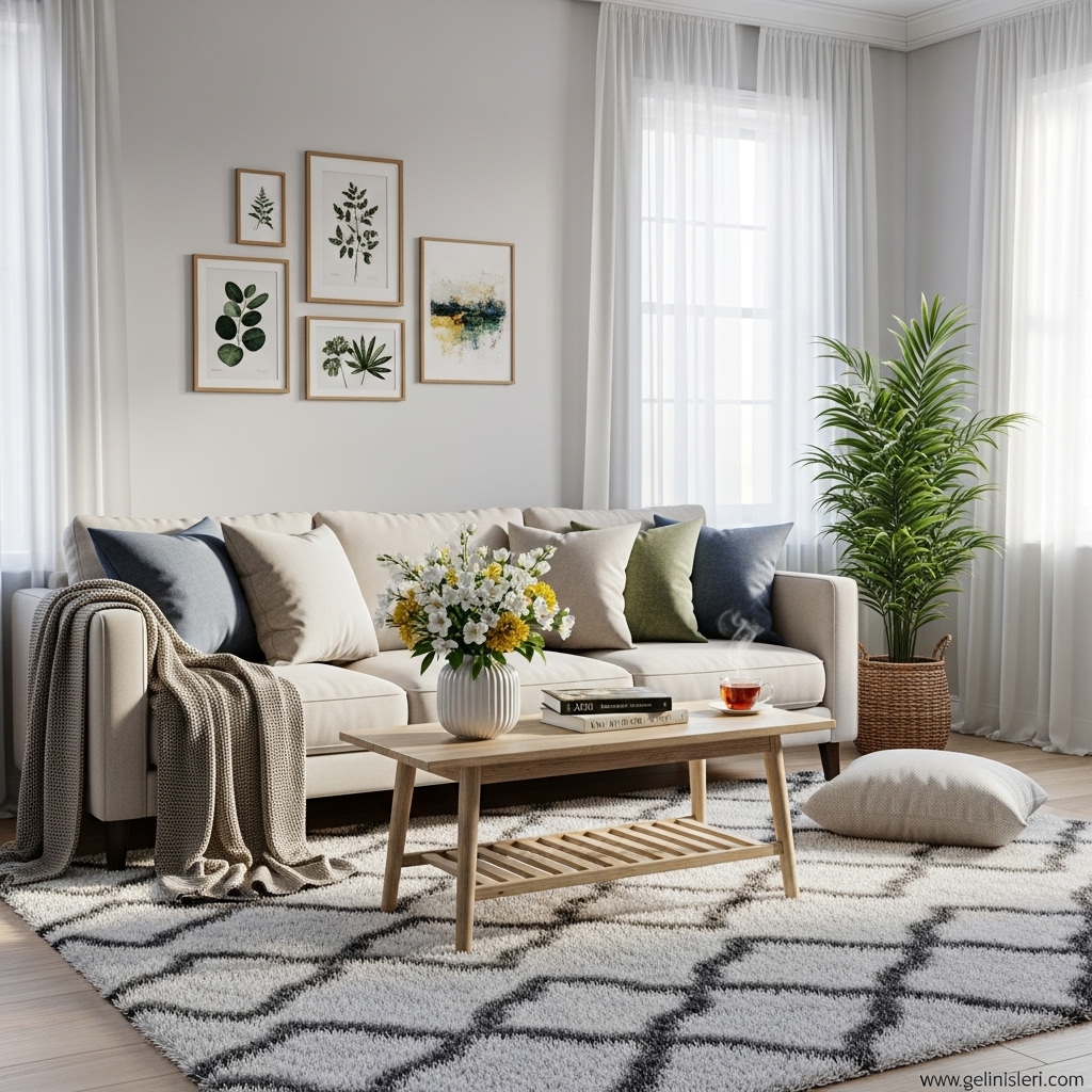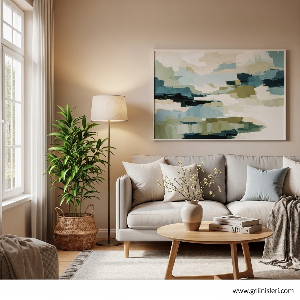Duvar tabloları, dekoratif yastıklar ve doğal dokulu objeler oturma odasına kişisel bir dokunuş katar.