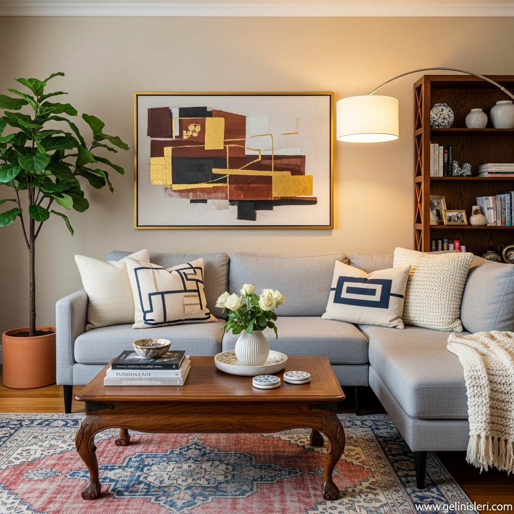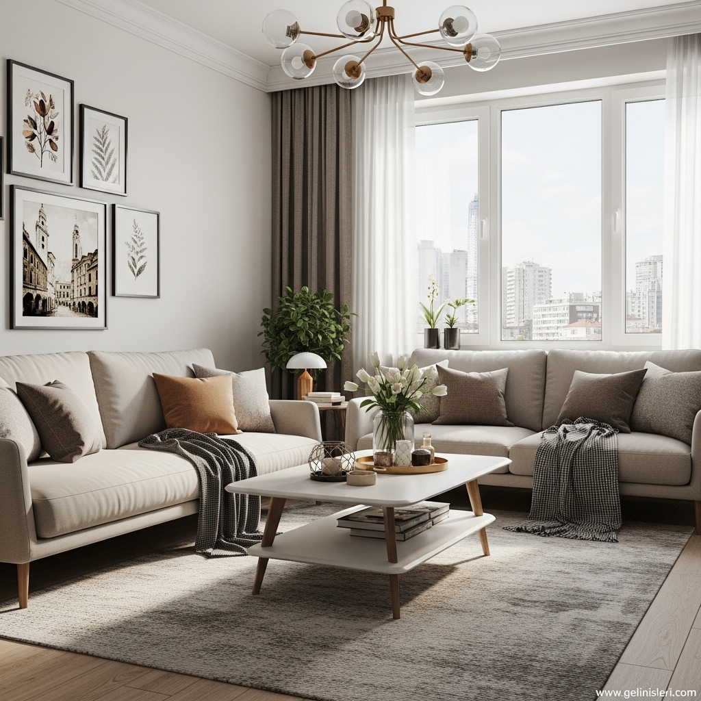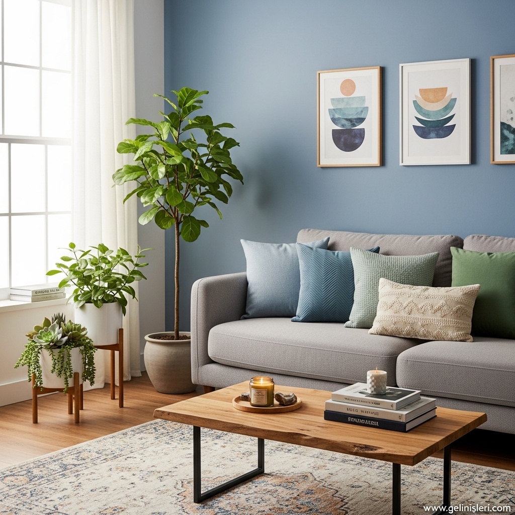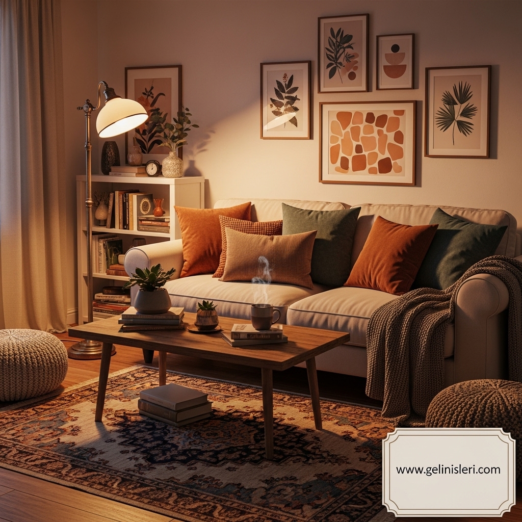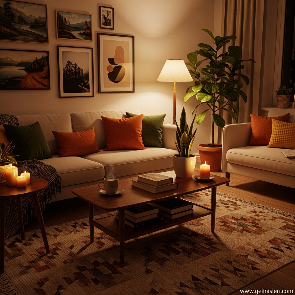 Duvar tabloları, dekoratif yastıklar ve doğal dokulu objeler oturma odasına kişisel bir dokunuş katar.