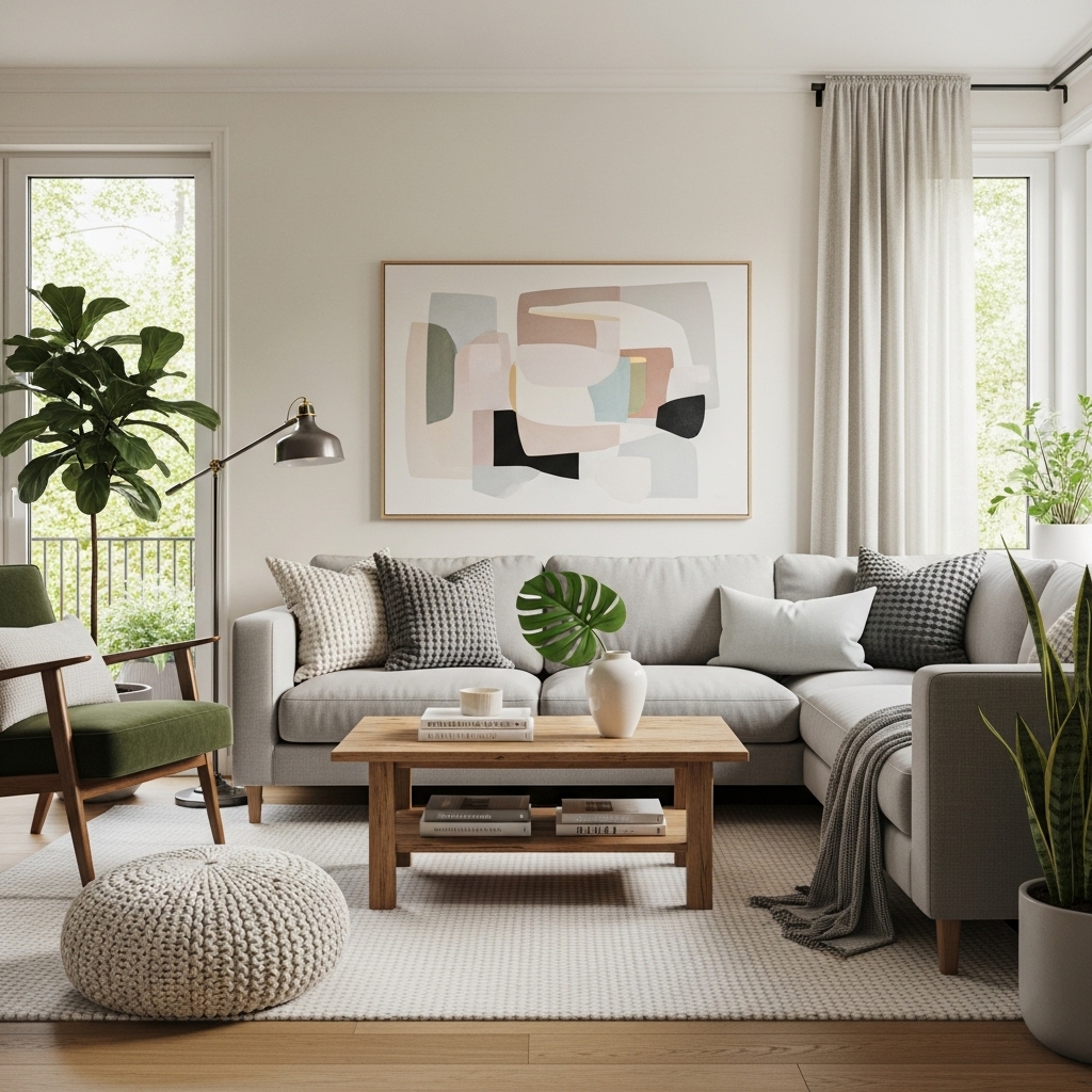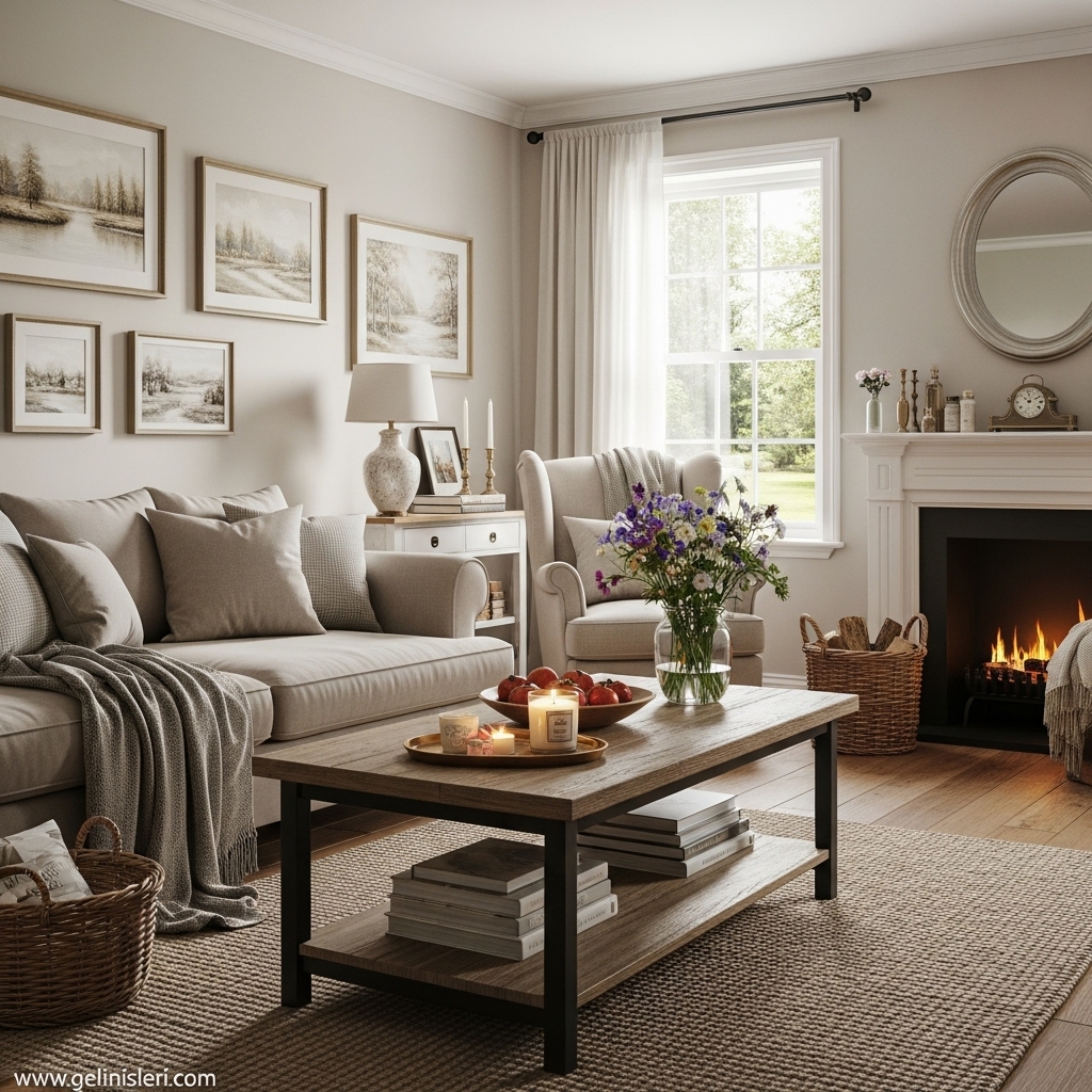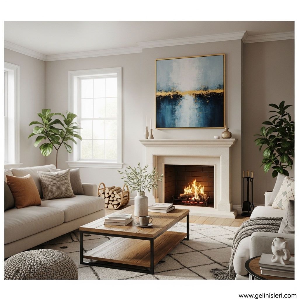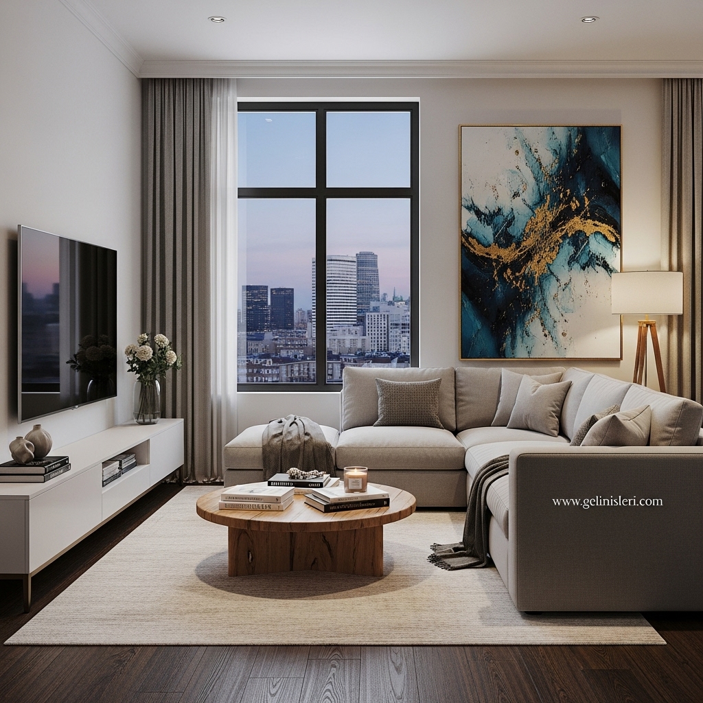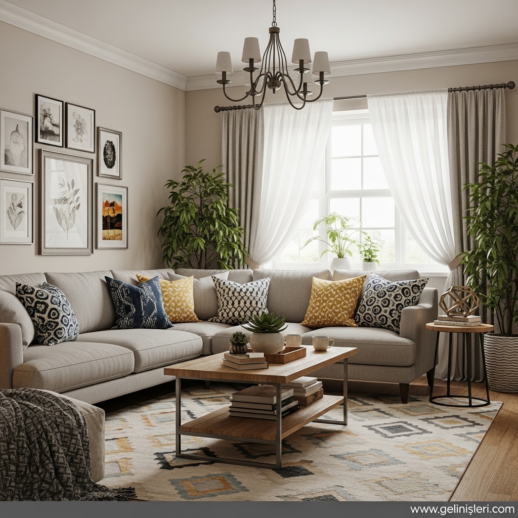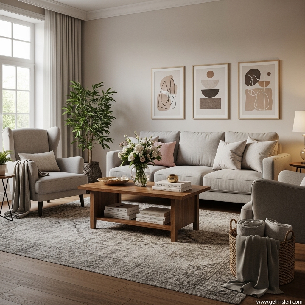 Duvar tabloları, dekoratif yastıklar ve doğal dokulu objeler oturma odasına kişisel bir dokunuş katar.
