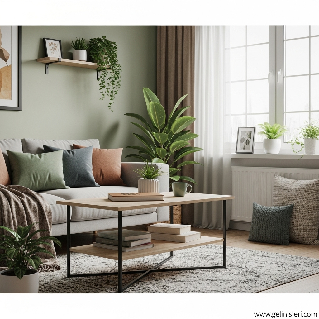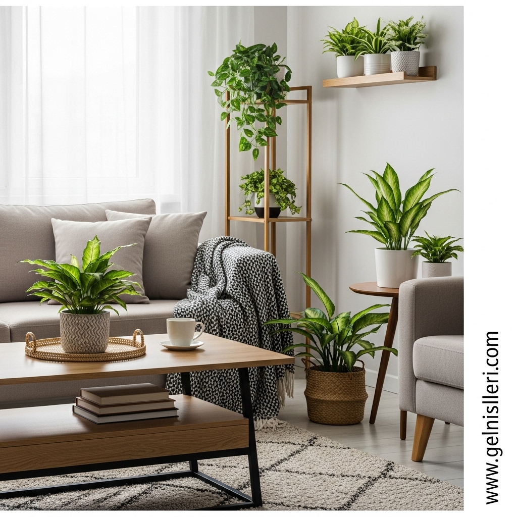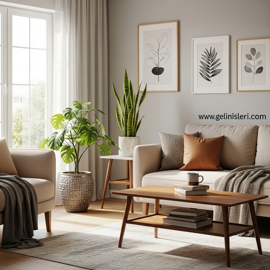 Bitkiler, oturma odasına canlılık kazandırırken aynı zamanda daha dengeli ve huzurlu bir atmosfer oluşturur.