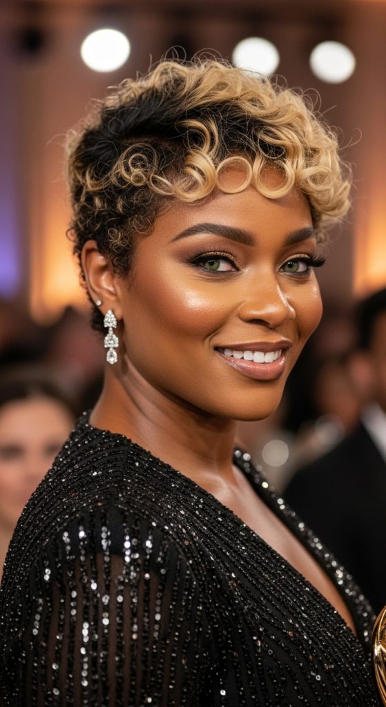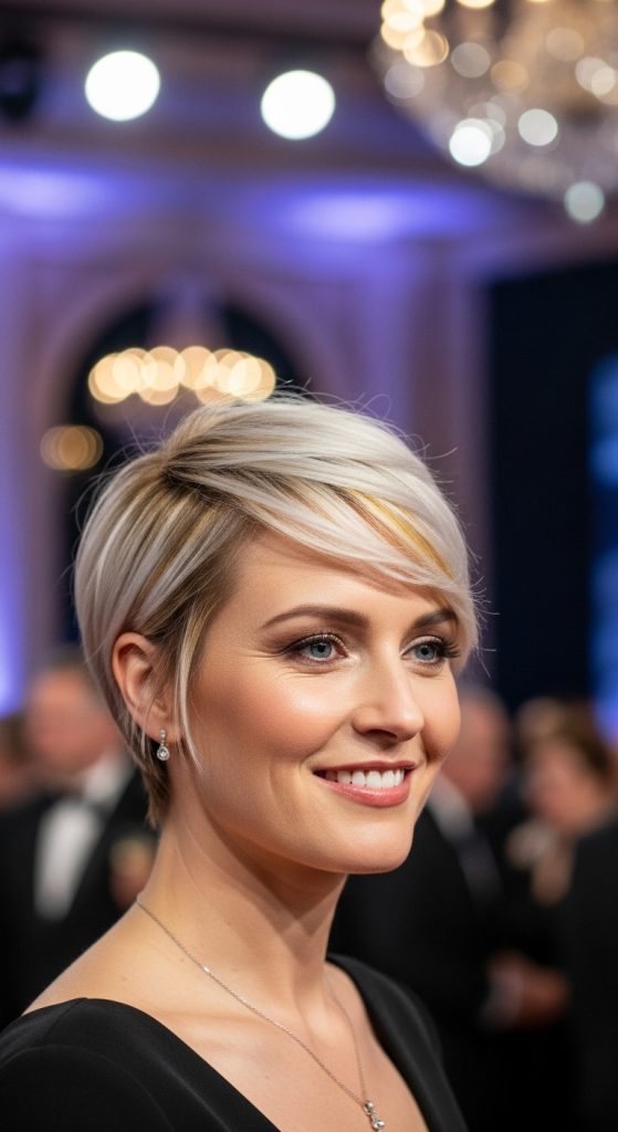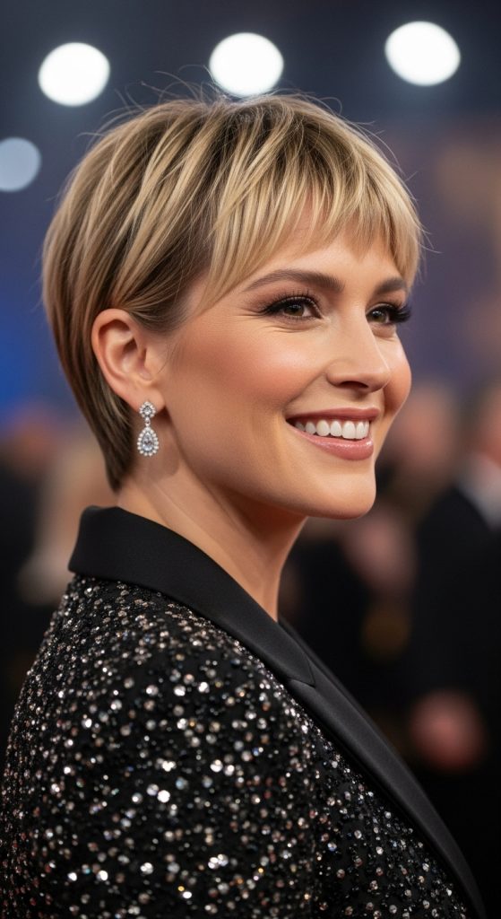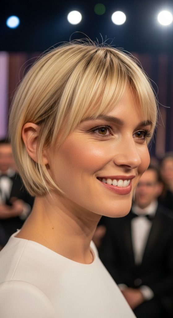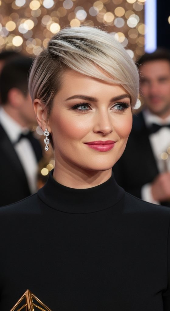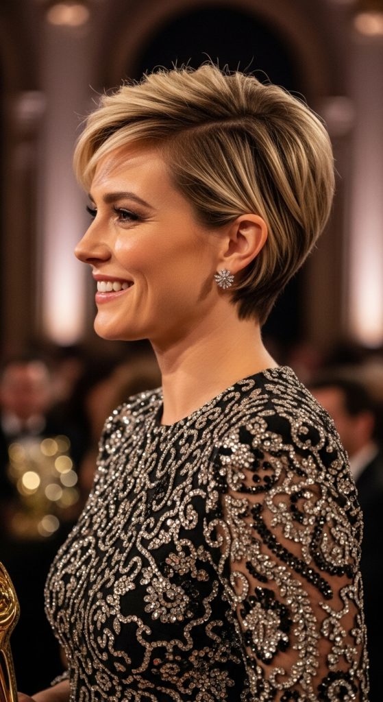 Sarı saçın ışıltısı, kısa kesimin netliğiyle birleştiğinde modern bir çekicilik yaratıyor.