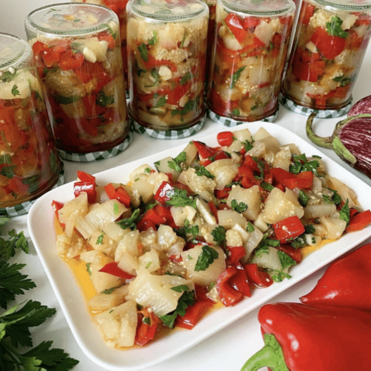 Patlicanlar yikanir soyulup küp küp dogranir ve tuzlu suda bekletilip suzulur. Genisce bir tencereye siviyag sirke ve tuz alinip kaynamaya birakilir kaynayinca üzerine önce patlicanlar iki seferde 15 er dakika pisirilip cikarilir ardindan dogranmis biberler iki seferde 15 er dakika pisirilip karistirma kabina cikarilir üzerine dogranmis maydonoz ve sarimsak alinip ezmeden dikkatlice karistirilir ardindan kavanozlara paylastirilir. Tencerede kalan siviyag sirke karisimi tekrar kaynatilip kavanozun üzerine eklenip kapagi hemen kapatilip masaya ters cevrilir kalan kavanozlarda ayni sekilde yapilir.Tamamen soguyan konserve serin ve günes görmeyen bir yerde muhafaza edilir